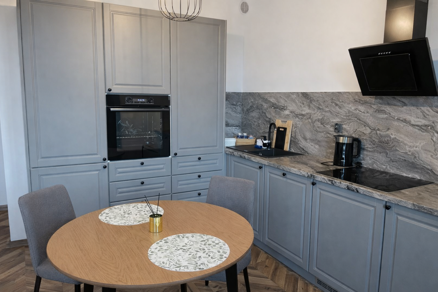A modern and bright apartment, ideal for a comfortable city stay, overlooking the courtyard and located on the ground floor of a renovated townhouse. The interior has been tastefully designed with attention to detail.The apartment features a fully equipped kitchenette with modern appliances, free Wi-Fi, a Smart TV, a comfortable lounge area, and a functional dining space. Guests can enjoy two comfortable single beds (90×200 cm) and a sofa bed, ensuring a restful night’s sleep even for a larger group. A stylish bathroom with a shower provides comfort and privacy. An excellent choice for both short and long stays – perfect for guests who appreciate high standards and well-designed interiors.