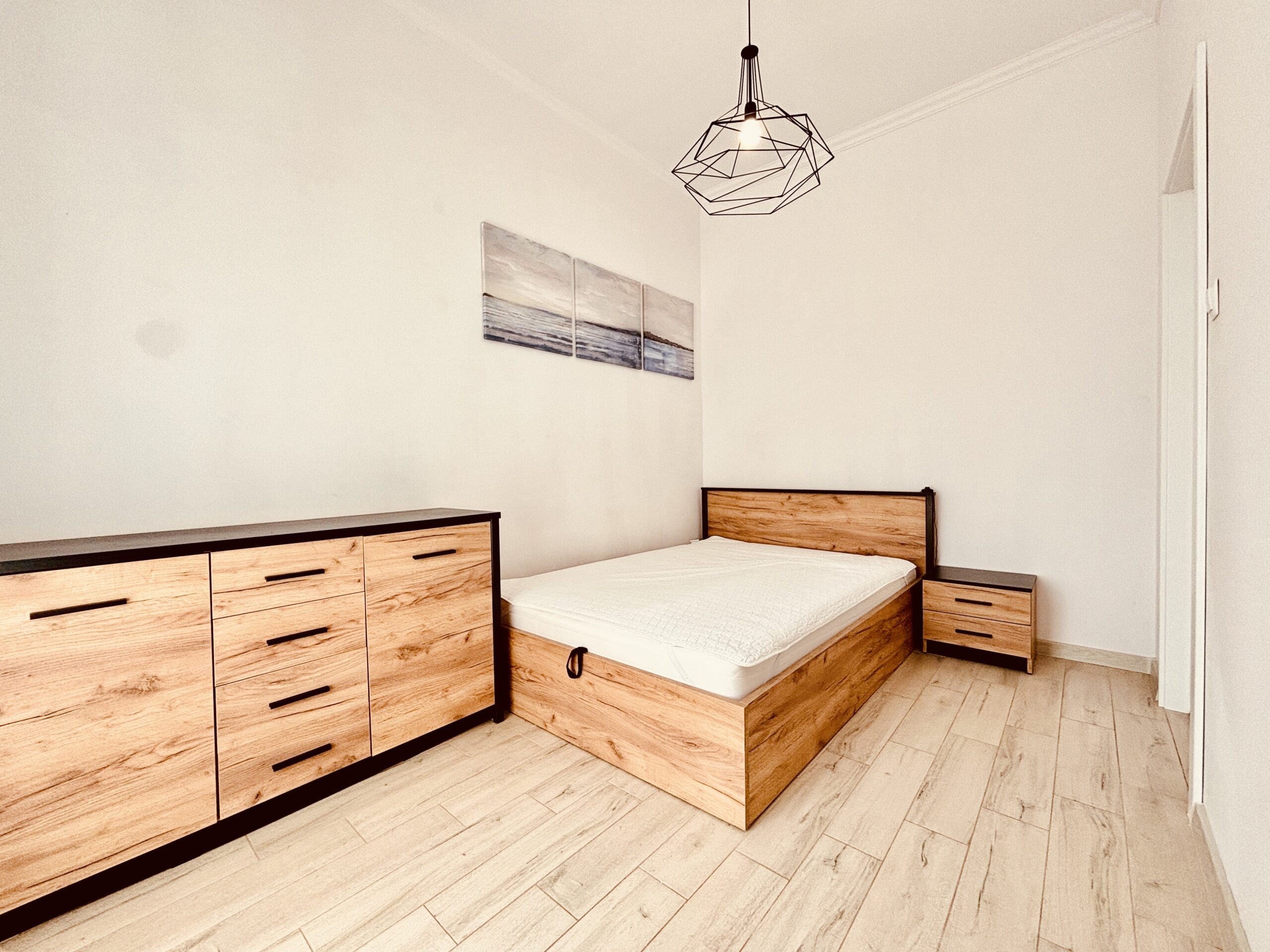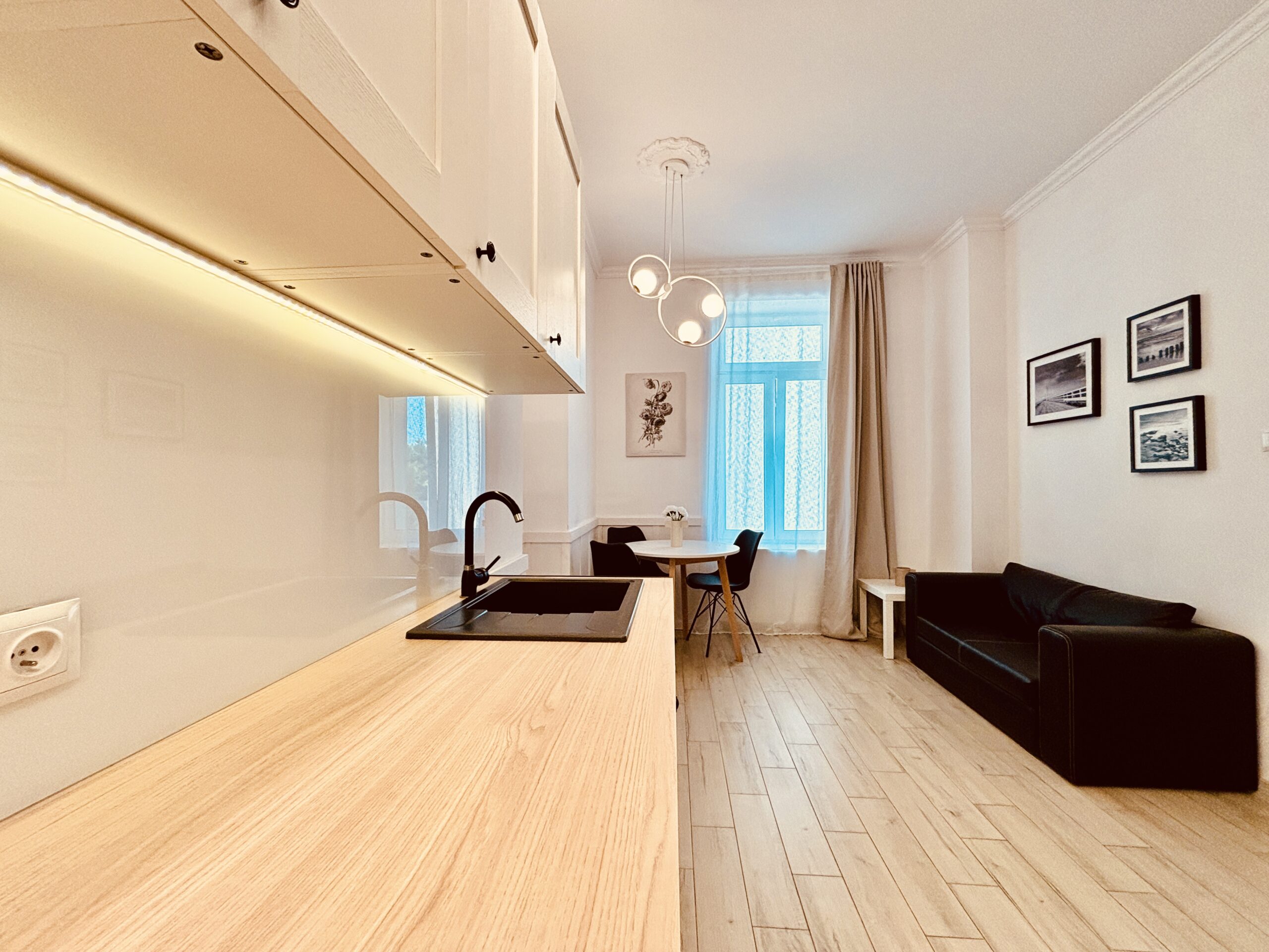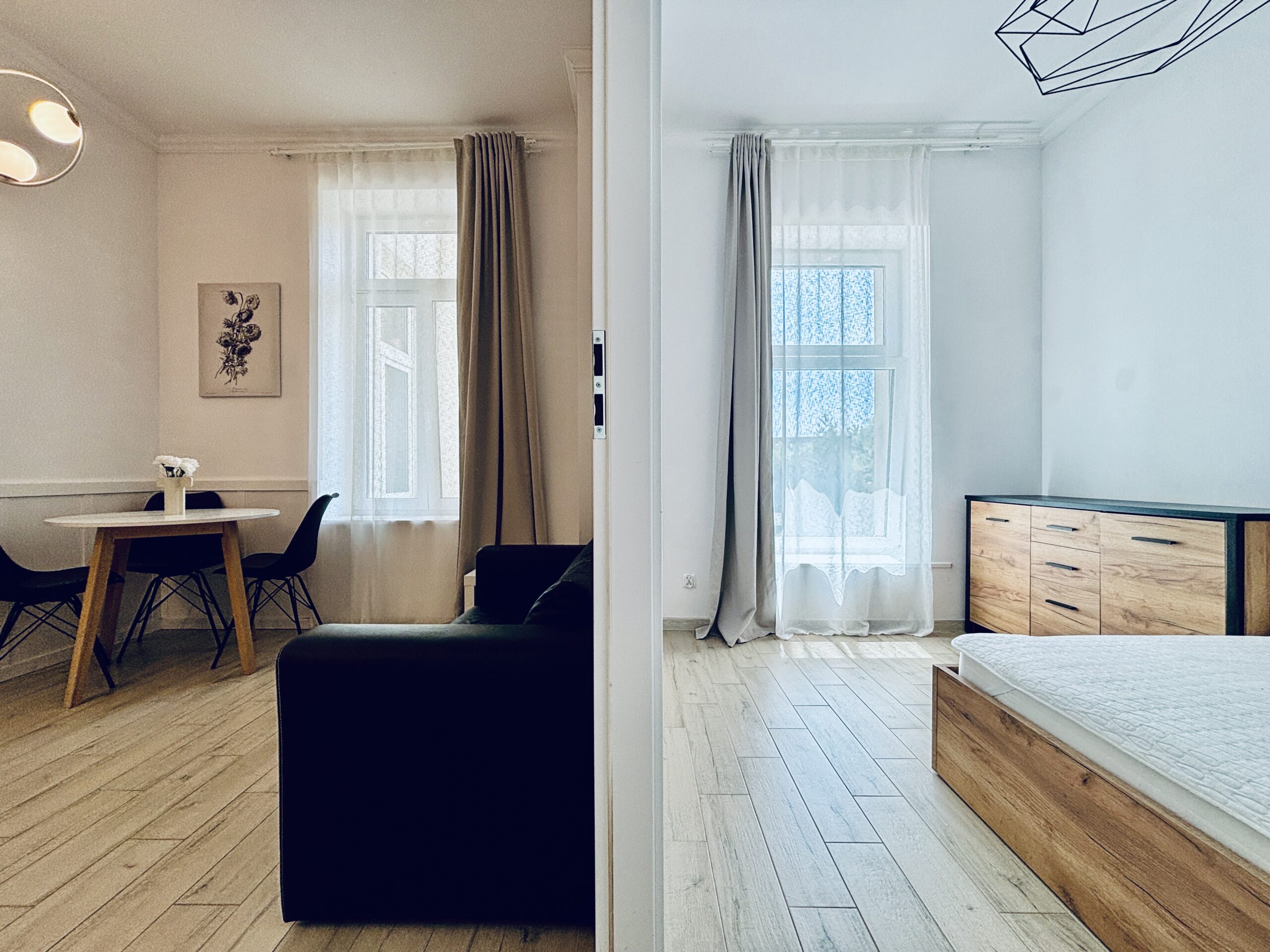 The apartment measures 28 m² and has been designed with guests’ comfort in mind. It features a well-equipped kitchen with essential utensils and modern appliances, connected to a small living area with a compact sofa, a 40-inch TV, and a dining table with chairs. The apartment also offers a separate bedroom with a comfortable 140×200 cm bed, a bathroom with a shower, and a washing machine.