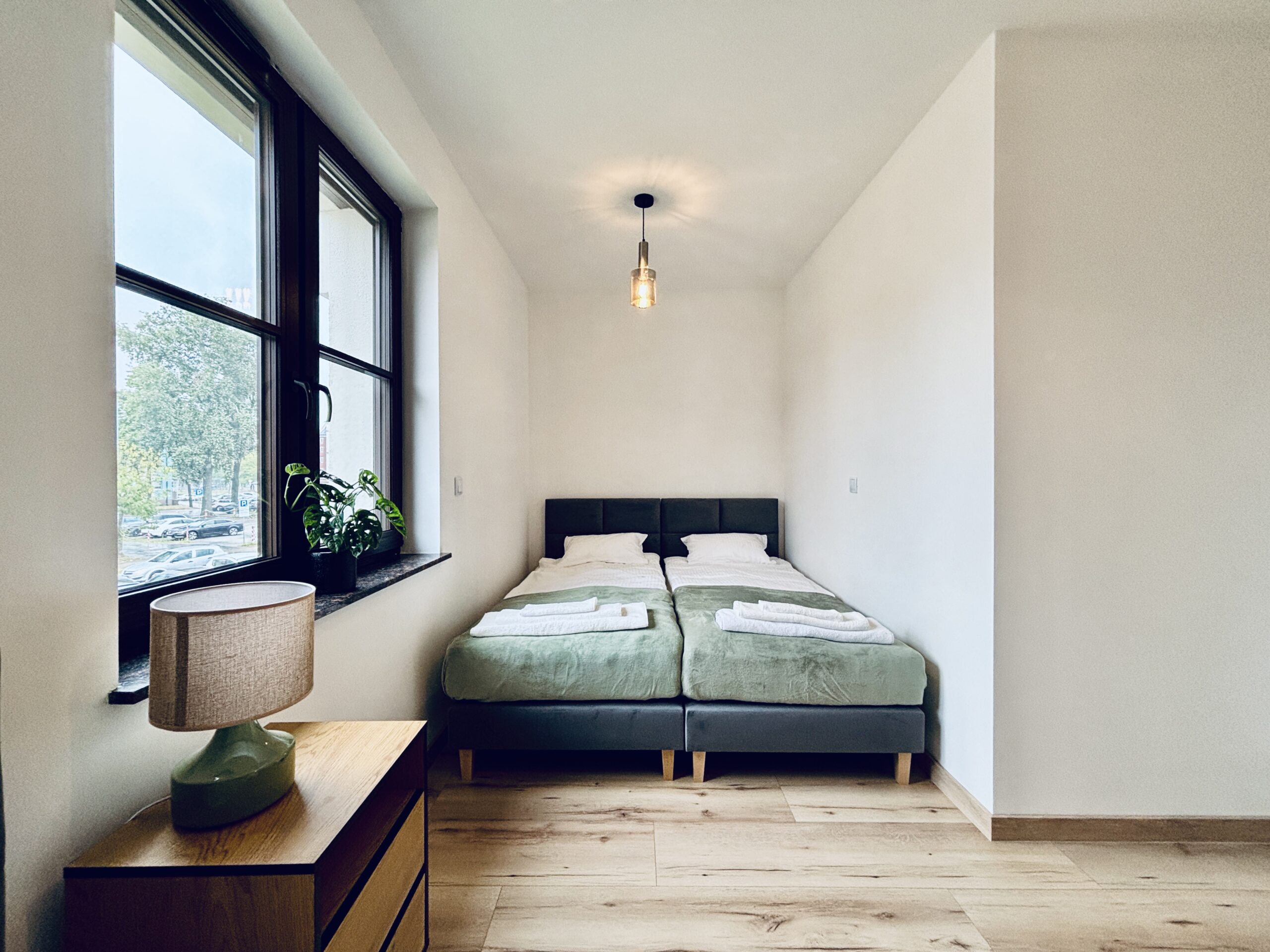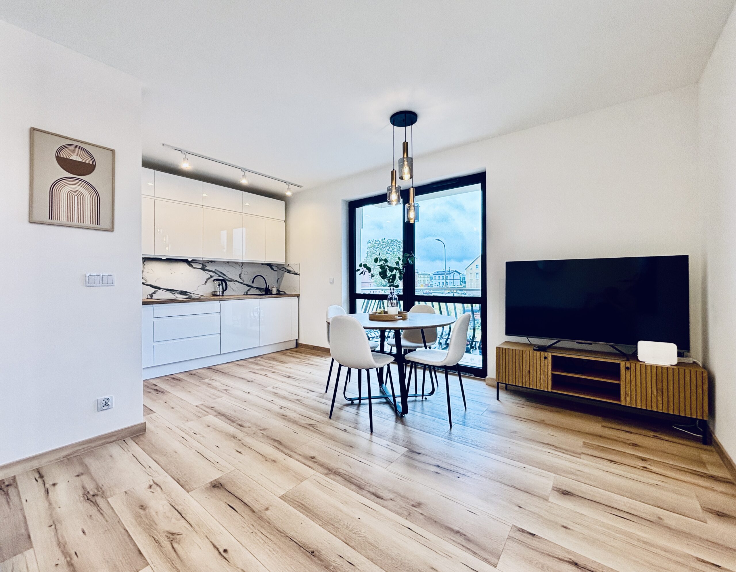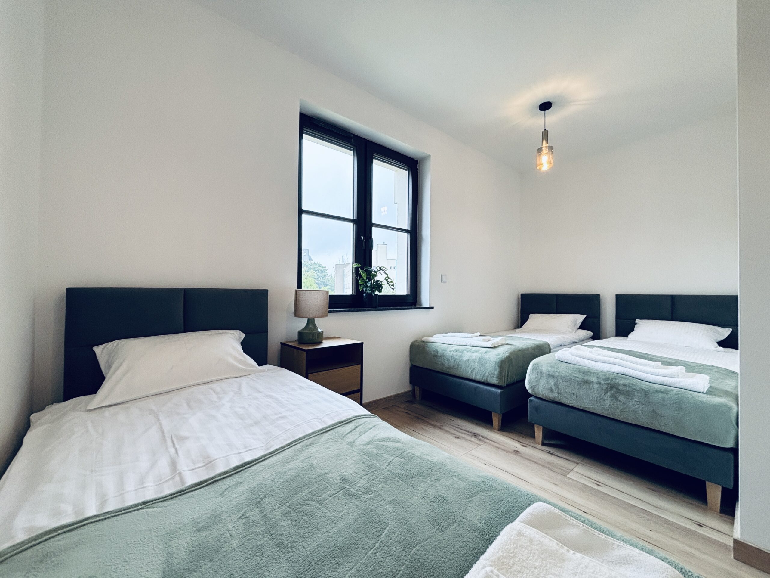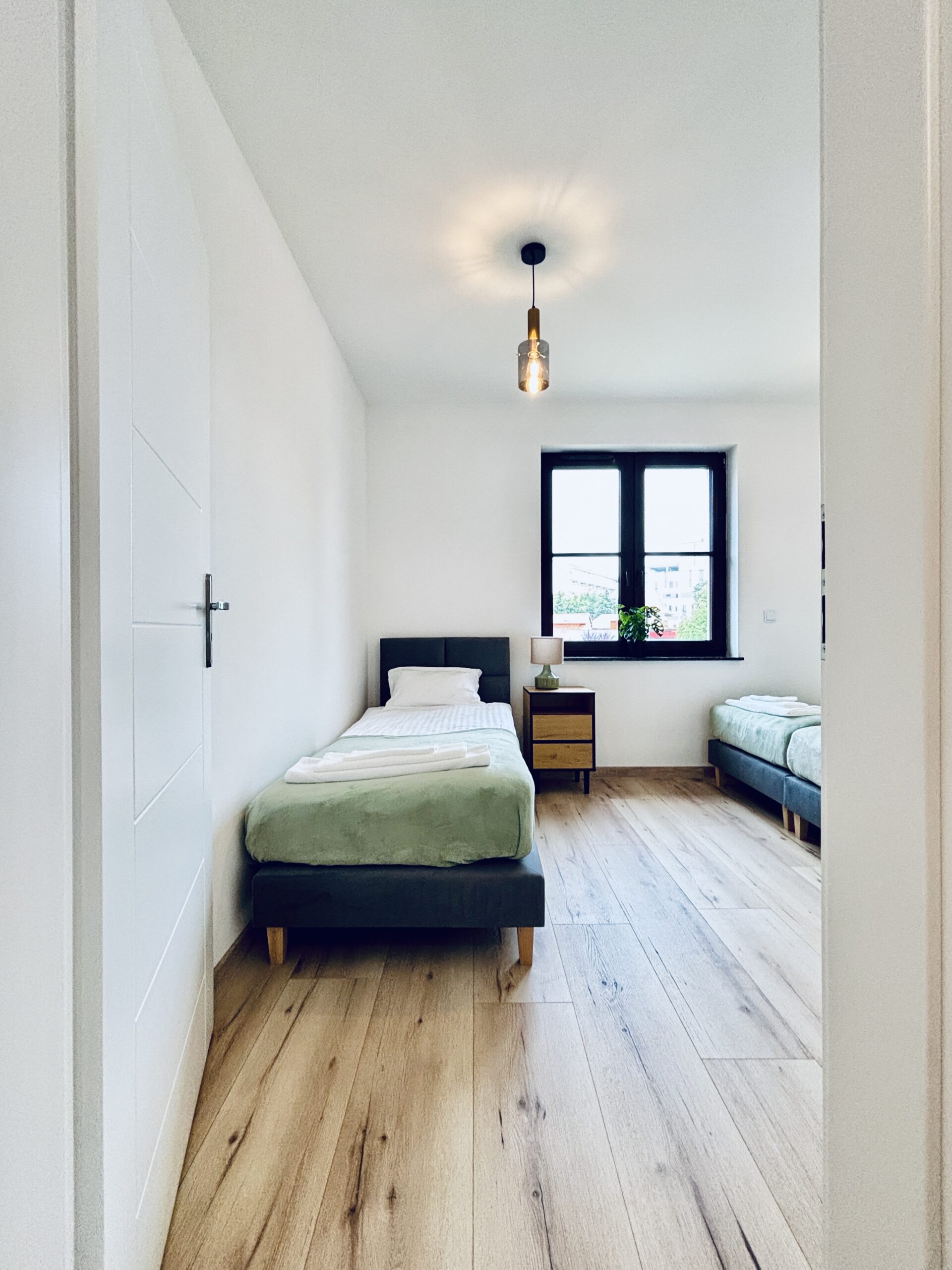 We invite you to stay in our spacious apartment featuring a separate bedroom with three single continental beds and a sofa bed in the living room. The fully equipped kitchenette, connected to the dining area, provides everything needed to prepare and enjoy meals comfortably on site. Additional comfort is ensured by amenities such as underfloor heating, a smart TV with cable channels, high-speed Wi-Fi, and a washing machine.